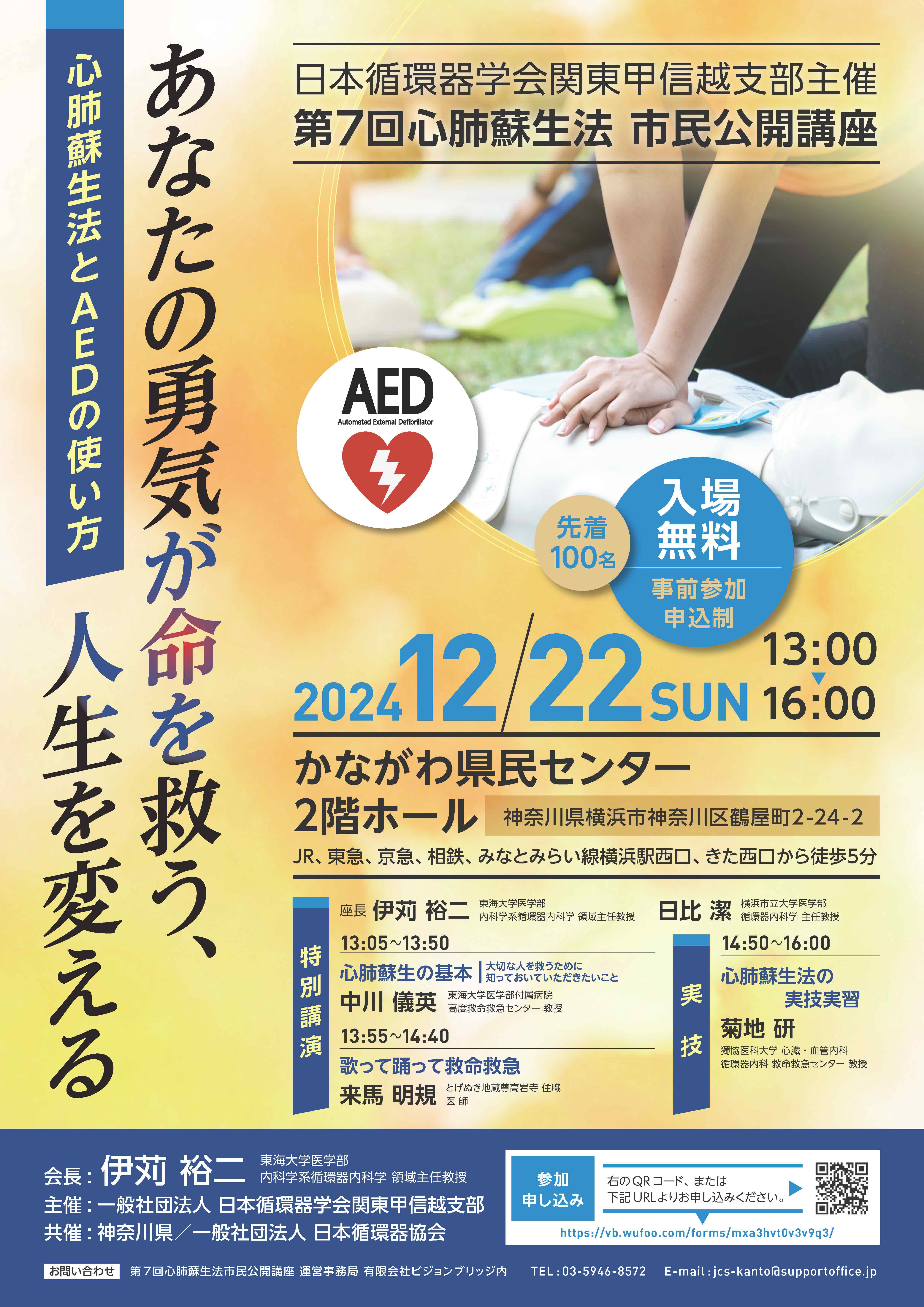 髙岩寺住職出演入場無料救急救命法講習会初心者向け JR横浜駅前で開催先着100人限定日本循環器学会関東甲信越支部主催第7回心肺蘇生法市民公開講座令和6年 12月 22日(日) 13時~16時かながわ県民センター2階ホール>>申込フォーム(外部サイト)>>第7回心肺蘇生法 市民公開講座 運営事務局(有)ビジョンブリッジ 内☎ 03-5946-8572